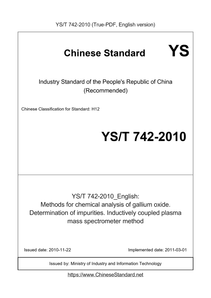 Delivery: <= 3 days. True-PDF full-copy in English will be manually translated and delivered via email. YS/T 742-2010: Methods for chemical analysis of gallium oxide. Determination of impurities. Inductively coupled plasma mass spectrometer method