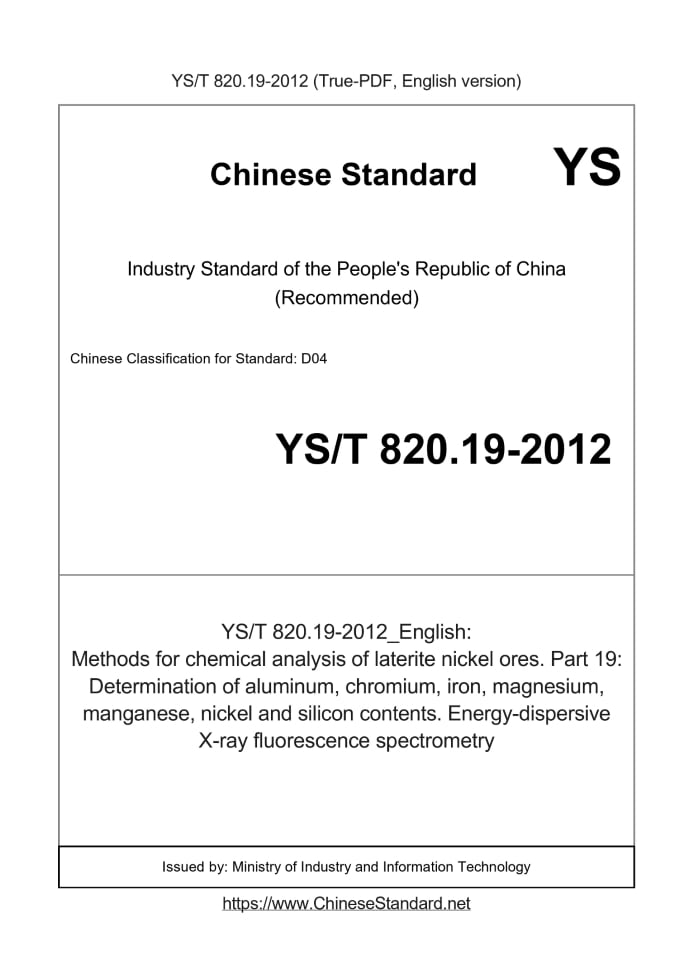 Delivery: <= 3 days. True-PDF full-copy in English will be manually translated and delivered via email. YS/T 820.19-2012: Methods for chemical analysis of laterite nickel ores. Part 19: Determination of aluminum, chromium, iron, magnesium, manganese, nickel and silicon contents. Energy-dispersive X-ray fluorescence spectrometry Status: Valid