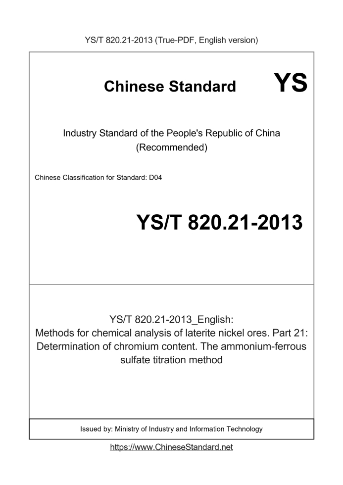Delivery: <= 3 days. True-PDF full-copy in English will be manually translated and delivered via email. YS/T 820.21-2013: Methods for chemical analysis of laterite nickel ores. Part 21: Determination of chromium content. The ammonium-ferrous sulfate titration method Status: Valid