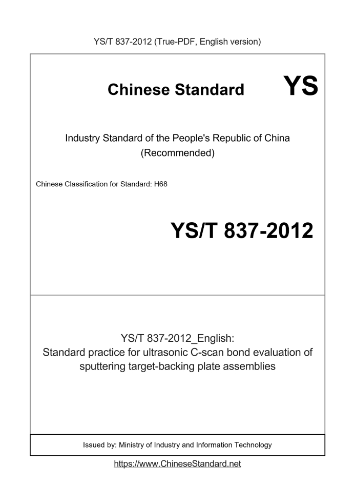 Delivery: <= 3 days. True-PDF full-copy in English will be manually translated and delivered via email. YS/T 837-2012: Standard practice for ultrasonic C-scan bond evaluation of sputtering target-backing plate assemblies Status: Valid