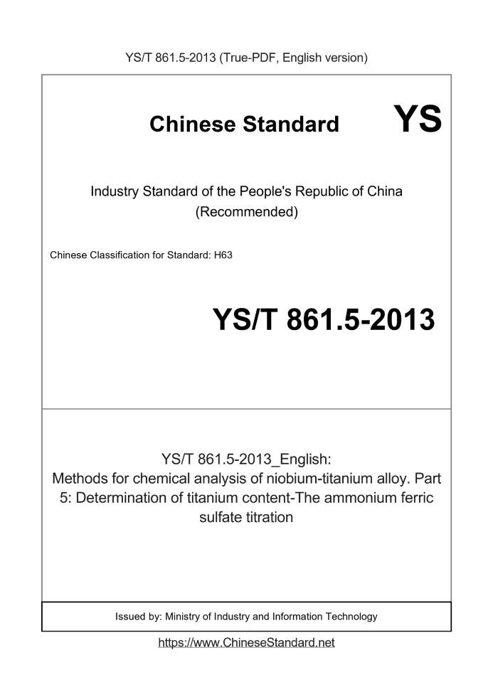 Delivery: <= 3 days. True-PDF full-copy in English will be manually translated and delivered via email. YS/T 861.5-2013: Methods for chemical analysis of niobium-titanium alloy. Part 5: Determination of titanium content-The ammonium ferric sulfate titration Status: Valid