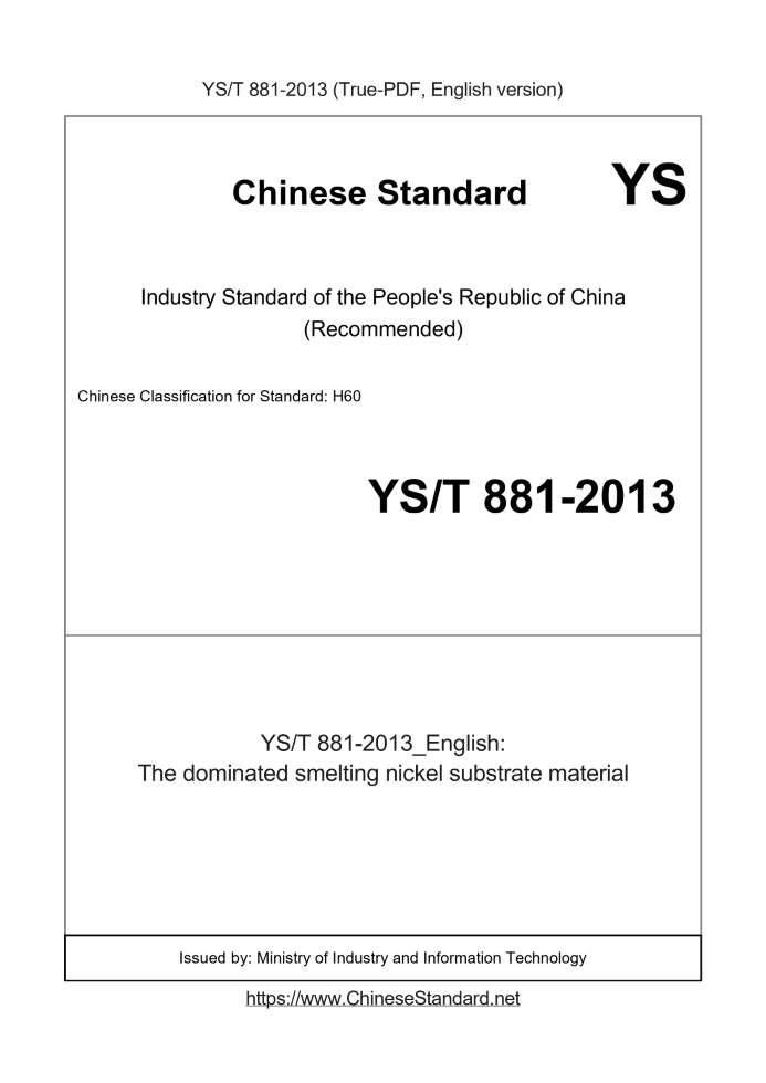 Delivery: <= 3 days. True-PDF full-copy in English will be manually translated and delivered via email. YS/T 881-2013: The dominated smelting nickel substrate material Status: Valid