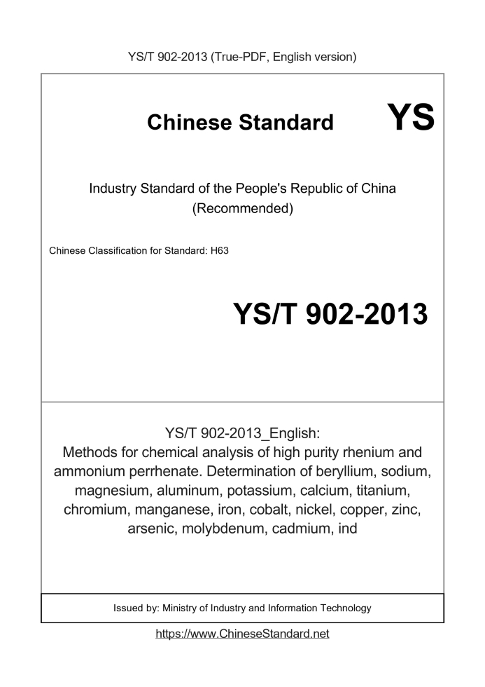 Delivery: <= 3 days. True-PDF full-copy in English will be manually translated and delivered via email. YS/T 902-2013: Methods for chemical analysis of high purity rhenium and ammonium perrhenate. Determination of beryllium, sodium, magnesium, aluminum, potassium, calcium, titanium, chromium, manganese, iron, cobalt, nickel, copper, zinc, arsenic, molybdenum, cadmium, ind Status: Valid