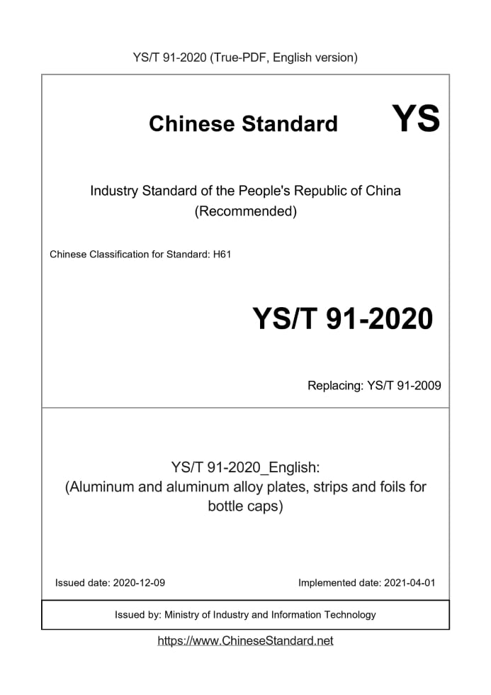 Delivery: <= 3 days. True-PDF full-copy in English will be manually translated and delivered via email. YS/T 91-2020: (Aluminum and aluminum alloy plates, strips and foils for bottle caps) Status: Valid YS/T 91: Historical versions