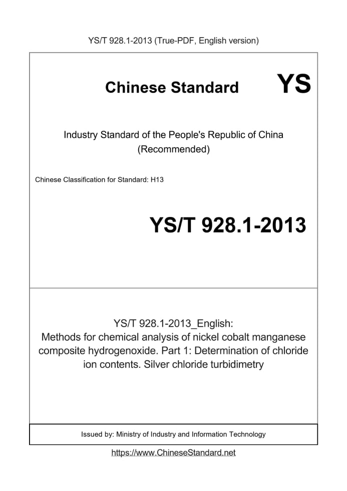Delivery: <= 3 days. True-PDF full-copy in English will be manually translated and delivered via email. YS/T 928.1-2013: Methods for chemical analysis of nickel cobalt manganese composite hydrogenoxide. Part 1: Determination of chloride ion contents. Silver chloride turbidimetry Status: Valid