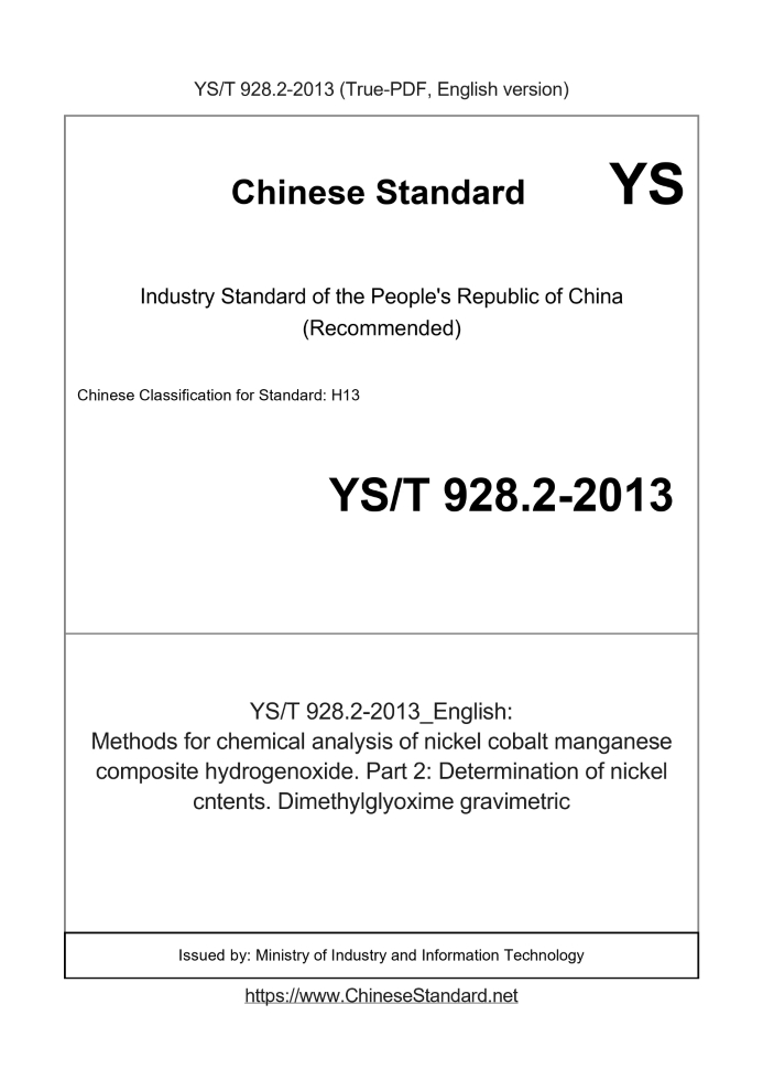Delivery: <= 3 days. True-PDF full-copy in English will be manually translated and delivered via email. YS/T 928.2-2013: Methods for chemical analysis of nickel cobalt manganese composite hydrogenoxide. Part 2: Determination of nickel cntents. Dimethylglyoxime gravimetric Status: Valid