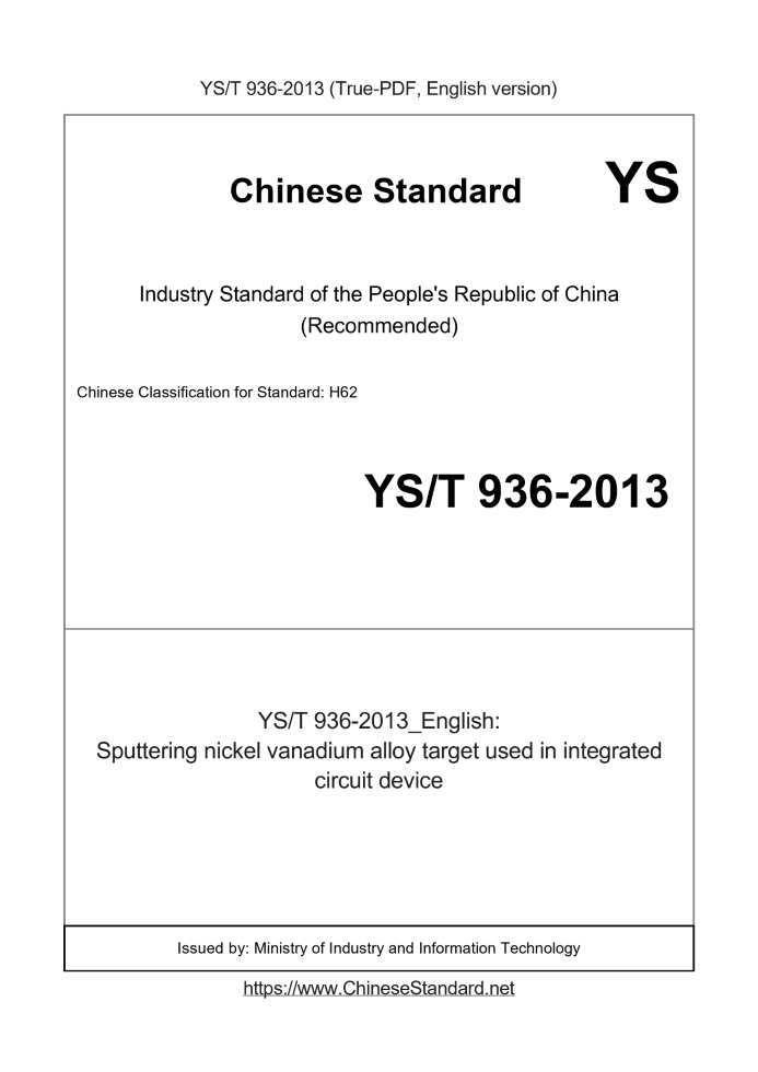 Delivery: <= 3 days. True-PDF full-copy in English will be manually translated and delivered via email. YS/T 936-2013: Sputtering nickel vanadium alloy target used in integrated circuit device Status: Valid