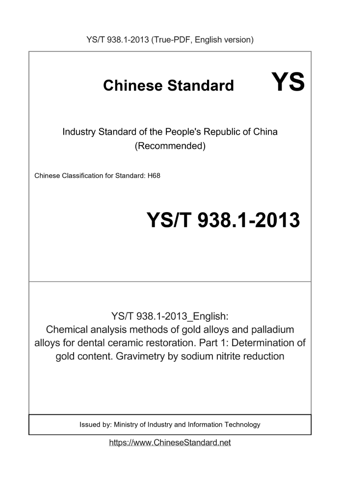 Delivery: <= 3 days. True-PDF full-copy in English will be manually translated and delivered via email. YS/T 938.1-2013: Chemical analysis methods of gold alloys and palladium alloys for dental ceramic restoration. Part 1: Determination of gold content. Gravimetry by sodium nitrite reduction Status: Valid