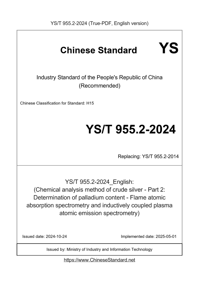 Delivery: <= 4 days. True-PDF full-copy in English will be manually translated and delivered via email. YS/T 955.2-2024: (Chemical analysis method of crude silver - Part 2: Determination of palladium content - Flame atomic absorption spectrometry and inductively coupled plasma atomic emission spectrometry) Status: Valid YS/T 955.2: Historical versions