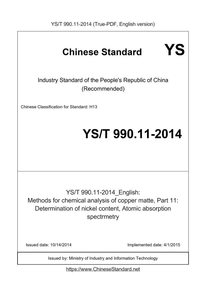 Delivery: <= 3 days. True-PDF full-copy in English will be manually translated and delivered via email. YS/T 990.11-2014: Methods for chemical analysis of copper matte, Part 11: Determination of nickel content, Atomic absorption spectrmetry Status: Valid