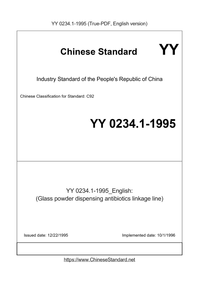 Delivery: <= 3 days. True-PDF full-copy in English will be manually translated and delivered via email. YY 0234.1-1995: (Glass powder dispensing antibiotics linkage line) Status: Obsolete