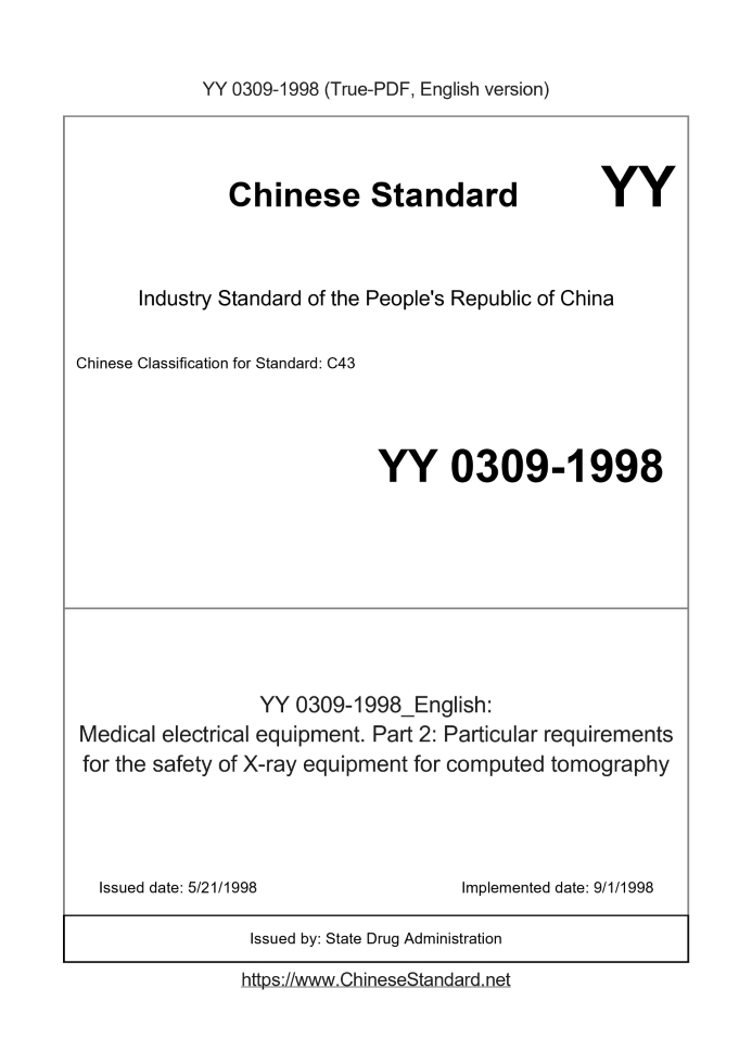 Delivery: <= 3 days. True-PDF full-copy in English will be manually translated and delivered via email. YY 0309-1998: Medical electrical equipment. Part 2: Particular requirements for the safety of X-ray equipment for computed tomography Status: Obsolete