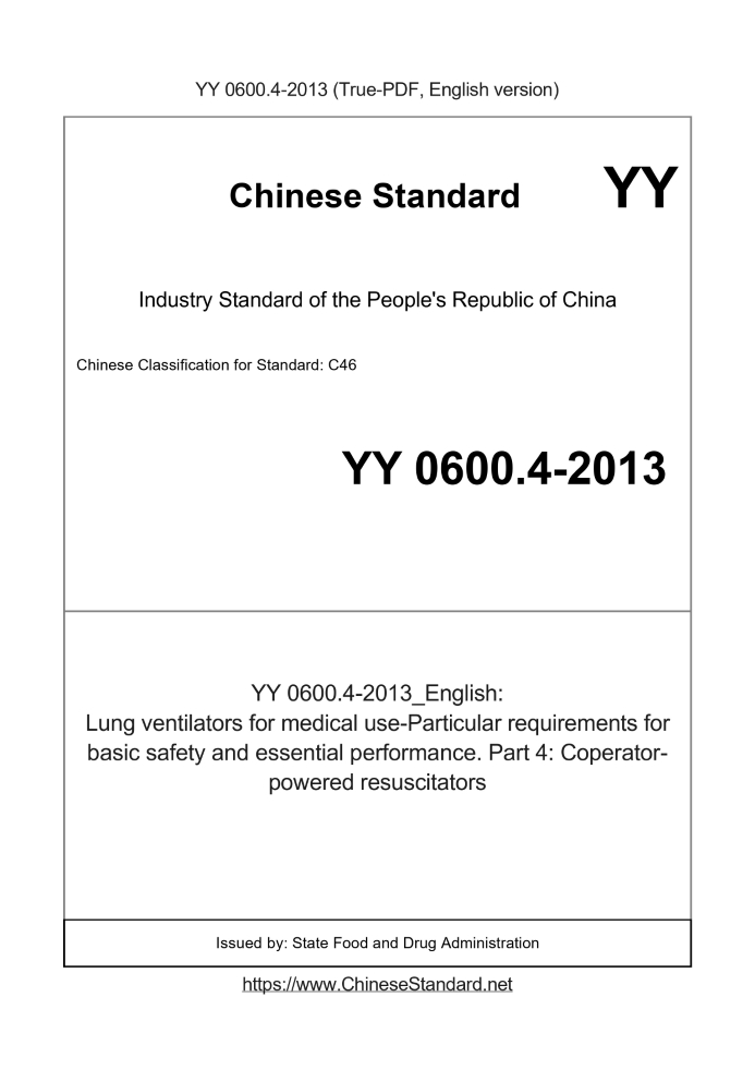 Delivery: <= 3 days. True-PDF full-copy in English will be manually translated and delivered via email. YY 0600.4-2013: Lung ventilators for medical use-Particular requirements for basic safety and essential performance. Part 4: Coperator-powered resuscitators Status: Valid