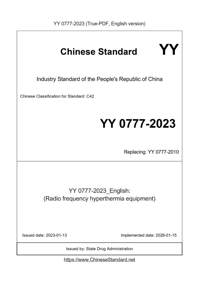 Delivery: <= 3 days. True-PDF full-copy in English will be manually translated and delivered via email. YY 0777-2023: (Radio frequency hyperthermia equipment) Status: Valid YY 0777: Historical versions