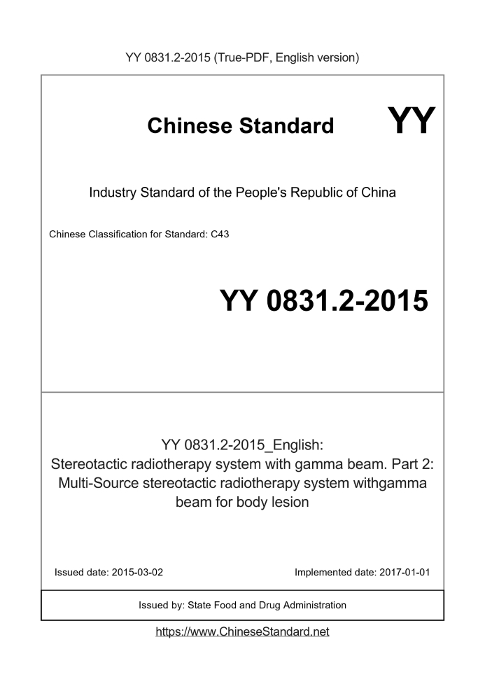 Delivery: <= 3 days. True-PDF full-copy in English will be manually translated and delivered via email. YY 0831.2-2015: Stereotactic radiotherapy system with gamma beam. Part 2: Multi-Source stereotactic radiotherapy system withgamma beam for body lesion Status: Valid