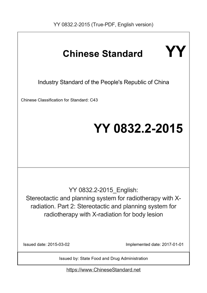Delivery: <= 3 days. True-PDF full-copy in English will be manually translated and delivered via email. YY 0832.2-2015: Stereotactic and planning system for radiotherapy with X-radiation. Part 2: Stereotactic and planning system for radiotherapy with X-radiation for body lesion Status: Valid