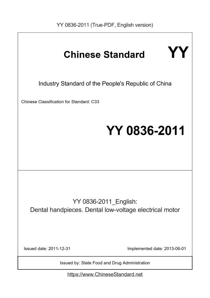 Delivery: <= 3 days. True-PDF full-copy in English will be manually translated and delivered via email. YY 0836-2011: Dental handpieces. Dental low-voltage electrical motor Status: Obsolete