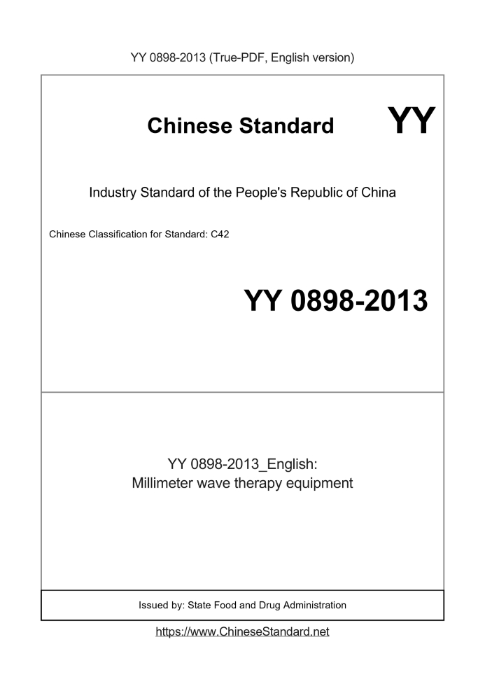 Delivery: <= 3 days. True-PDF full-copy in English will be manually translated and delivered via email. YY 0898-2013: Millimeter wave therapy equipment Status: Obsolete