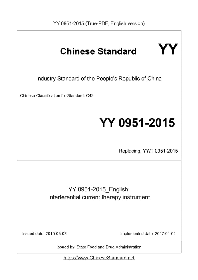 Delivery: <= 3 days. True-PDF full-copy in English will be manually translated and delivered via email. YY 0951-2015: Interferential current therapy instrument Status: Obsolete YY 0951: Historical versions