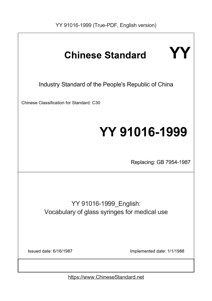 Delivery: <= 2 days. True-PDF full-copy in English will be manually translated and delivered via email. YY 91016-1999: Vocabulary of glass syringes for medical use Status: Obsolete