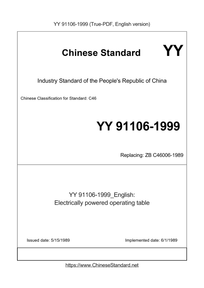 Delivery: <= 4 days. True-PDF full-copy in English will be manually translated and delivered via email. YY 91106-1999: Electrically powered operating table Status: Obsolete