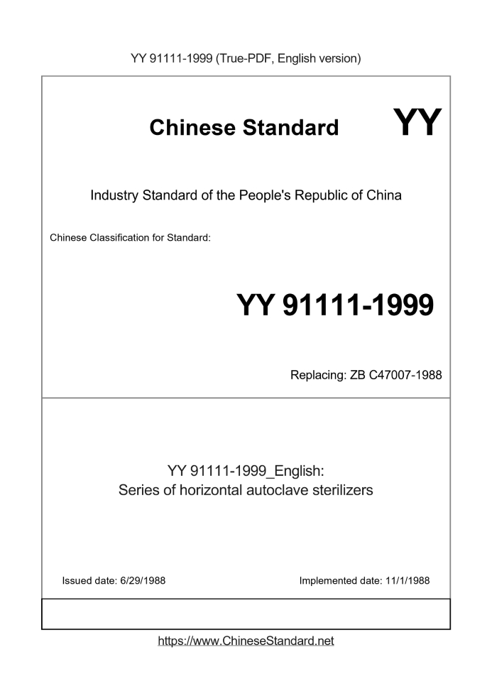 Delivery: <= 2 days. True-PDF full-copy in English will be manually translated and delivered via email. YY 91111-1999: Series of horizontal autoclave sterilizers Status: Obsolete
