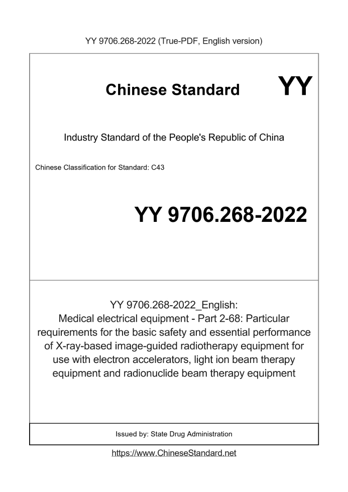Delivery: <= 6 days. True-PDF full-copy in English will be manually translated and delivered via email. YY 9706.268-2022: Medical electrical equipment - Part 2-68: Particular requirements for the basic safety and essential performance of X-ray-based image-guided radiotherapy equipment for use with electron accelerators, light ion beam therapy equipment and radionuclide beam therapy equipment Status: Valid