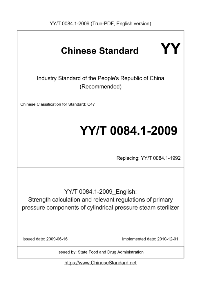 Delivery: <= 4 days. True-PDF full-copy in English will be manually translated and delivered via email. YY/T 0084.1-2009: Strength calculation and relevant regulations of primary pressure components of cylindrical pressure steam sterilizer YY/T 0084.1: Historical versions