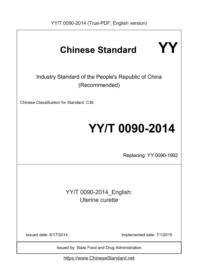 Delivery: <= 3 days. True-PDF full-copy in English will be manually translated and delivered via email. YY/T 0090-2014: Uterine curette Status: Valid YY/T 0090: Historical versions