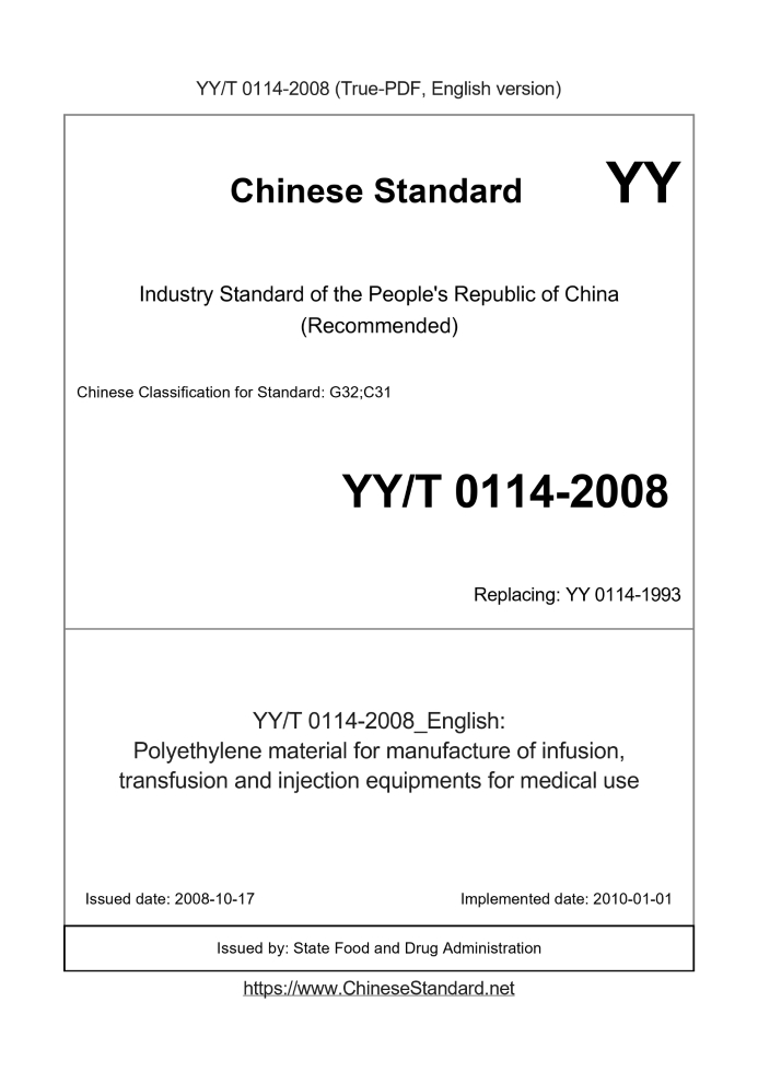 Delivery: <= 3 days. True-PDF full-copy in English will be manually translated and delivered via email. YY/T 0114-2008: Polyethylene material for manufacture of infusion, transfusion and injection equipments for medical use YY/T 0114: Historical versions