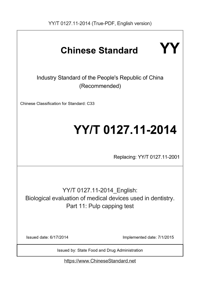 Delivery: <= 3 days. True-PDF full-copy in English will be manually translated and delivered via email. YY/T 0127.11-2014: Biological evaluation of medical devices used in dentistry. Part 11: Pulp capping test Status: Valid YY/T 0127.11: Historical versions