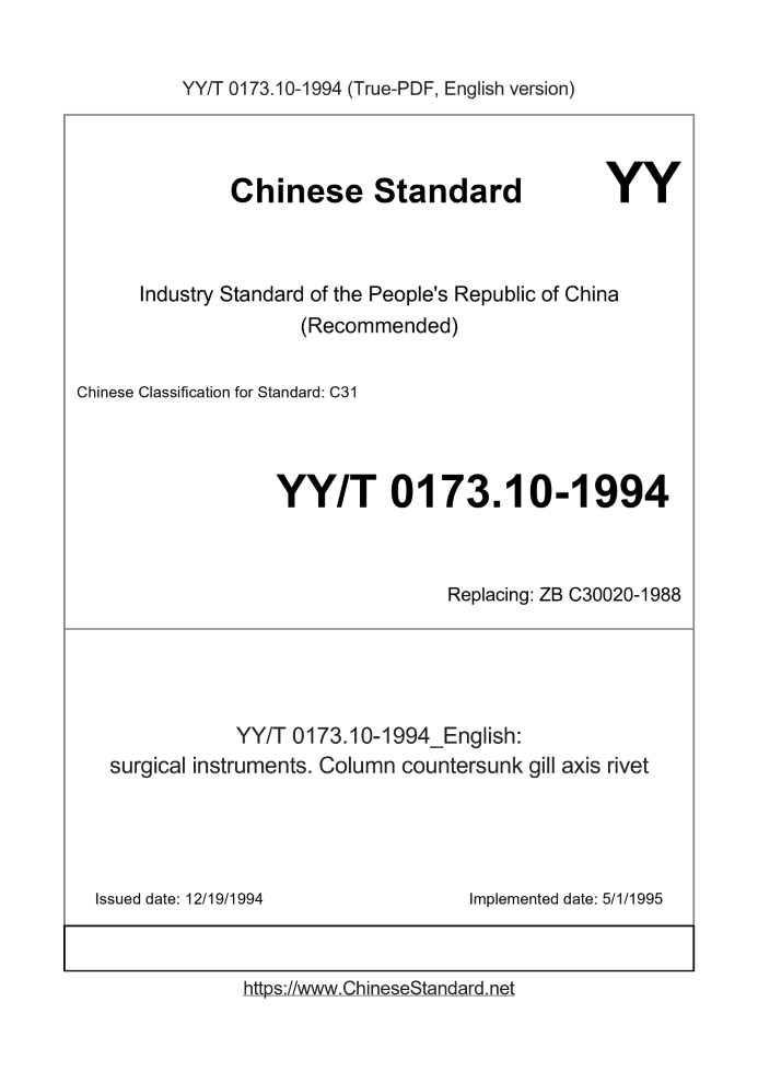 Delivery: <= 2 days. True-PDF full-copy in English will be manually translated and delivered via email. YY/T 0173.10-1994: surgical instruments. Column countersunk gill axis rivet Status: Obsolete