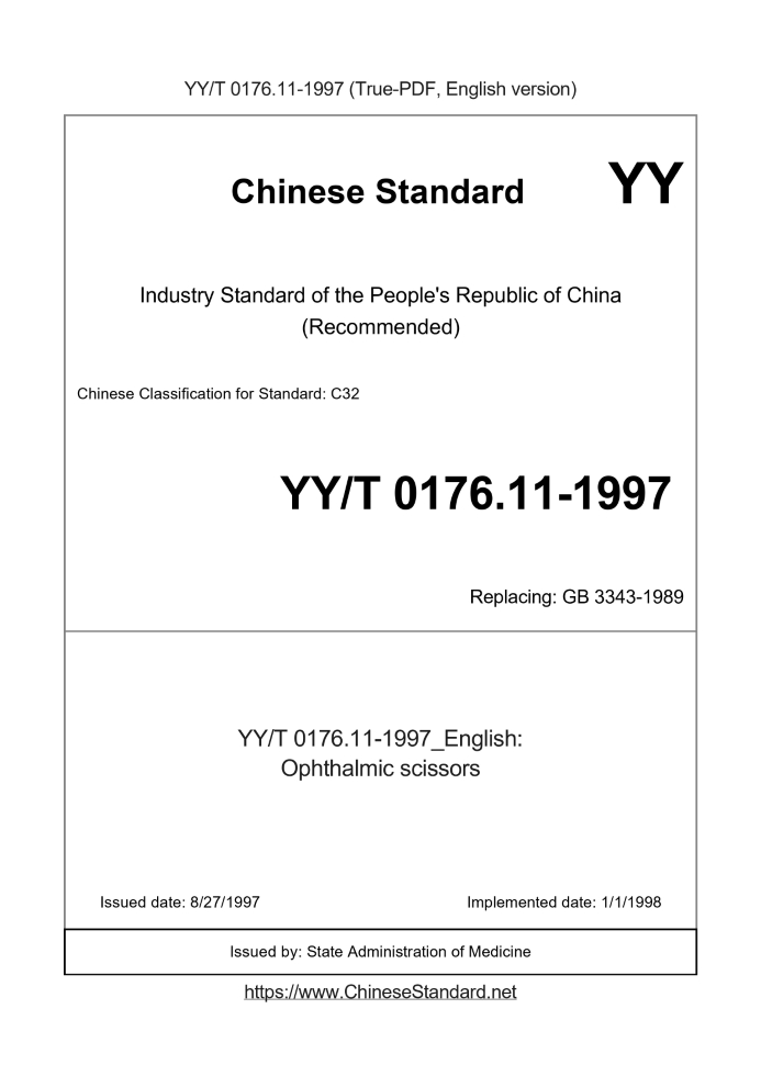 Delivery: <= 2 days. True-PDF full-copy in English will be manually translated and delivered via email. YY/T 0176.11-1997: Ophthalmic scissors Status: Obsolete