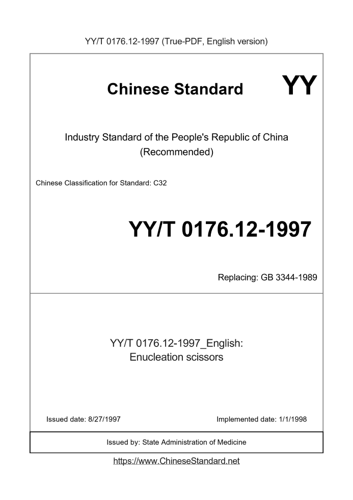 Delivery: <= 2 days. True-PDF full-copy in English will be manually translated and delivered via email. YY/T 0176.12-1997: Enucleation scissors Status: Obsolete
