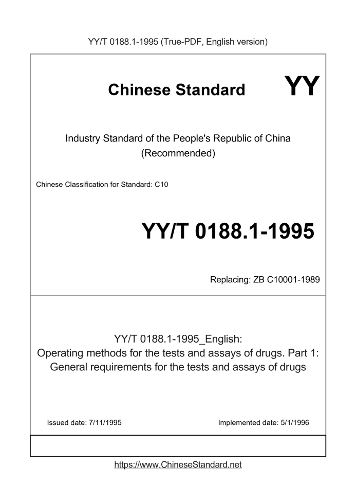 Delivery: <= 6 days. True-PDF full-copy in English will be manually translated and delivered via email. YY/T 0188.1-1995: Operating methods for the tests and assays of drugs. Part 1: General requirements for the tests and assays of drugs Status: Obsolete