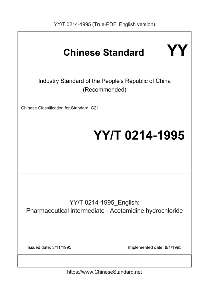 Delivery: <= 2 days. True-PDF full-copy in English will be manually translated and delivered via email. YY/T 0214-1995: Pharmaceutical intermediate - Acetamidine hydrochloride