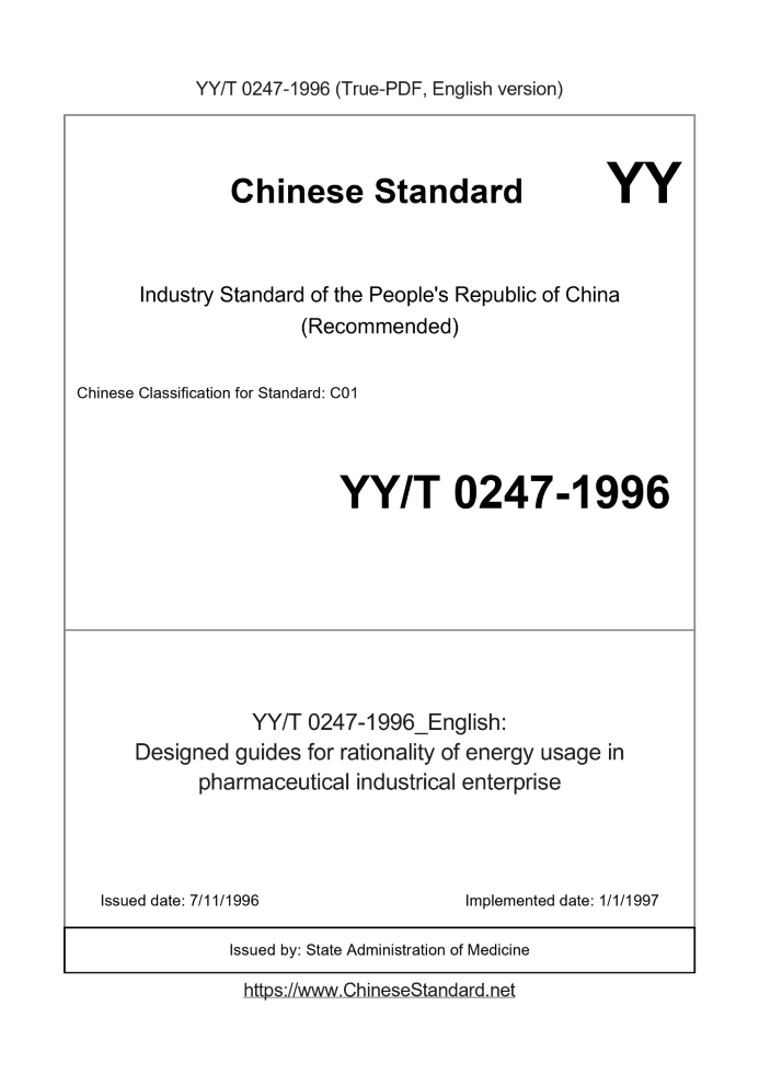Delivery: <= 3 days. True-PDF full-copy in English will be manually translated and delivered via email. YY/T 0247-1996: Designed guides for rationality of energy usage in pharmaceutical industrical enterprise
