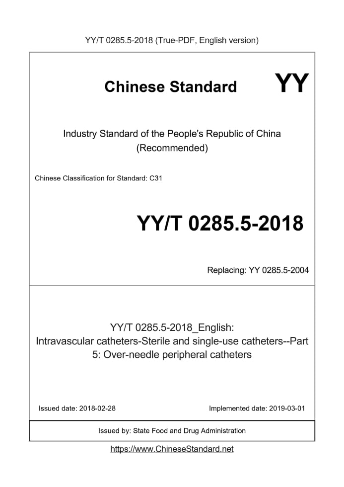 Delivery: <= 3 days. True-PDF full-copy in English will be manually translated and delivered via email. YY/T 0285.5-2018: Intravascular catheters-Sterile and single-use catheters--Part 5: Over-needle peripheral catheters Status: Valid YY/T 0285.5: Historical versions