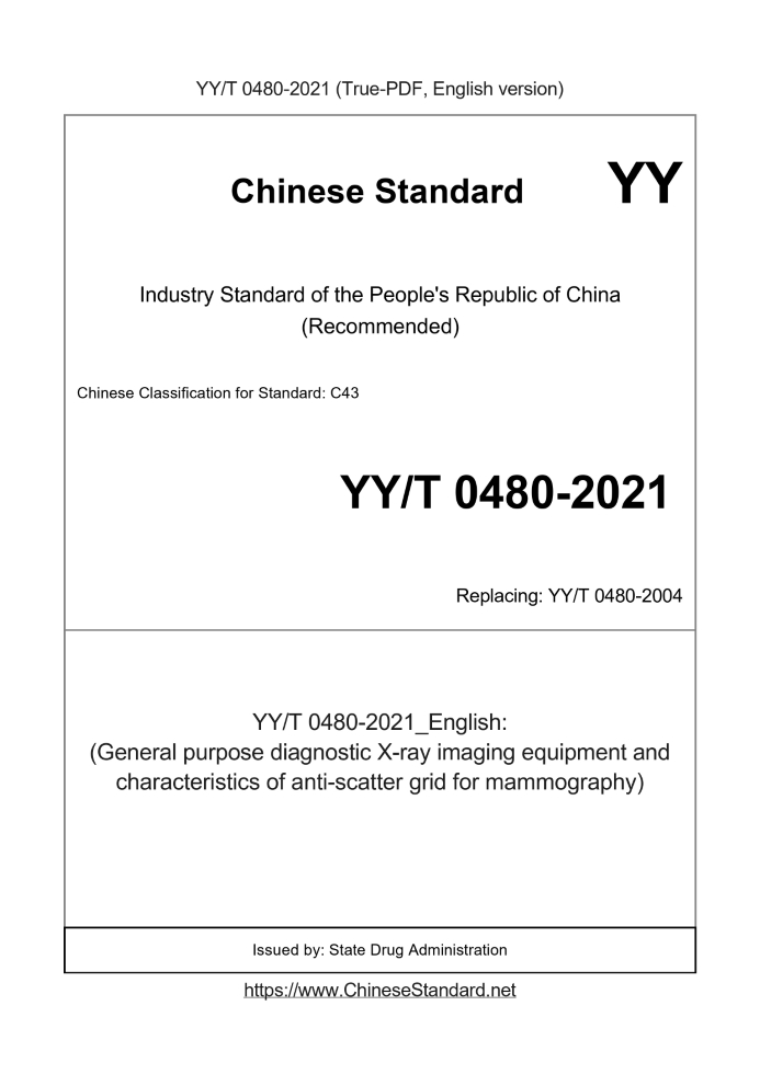 Delivery: <= 5 days. True-PDF full-copy in English will be manually translated and delivered via email. YY/T 0480-2021: (General purpose diagnostic X-ray imaging equipment and characteristics of anti-scatter grid for mammography) Status: Valid YY/T 0480: Historical versions