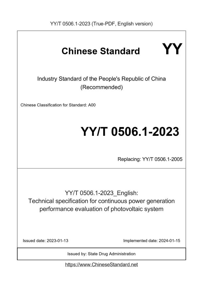 Delivery: <= 4 days. True-PDF full-copy in English will be manually translated and delivered via email. YY/T 0506.1-2023: Technical specification for continuous power generation performance evaluation of photovoltaic system Status: Valid YY/T 0506.1: Historical versions
