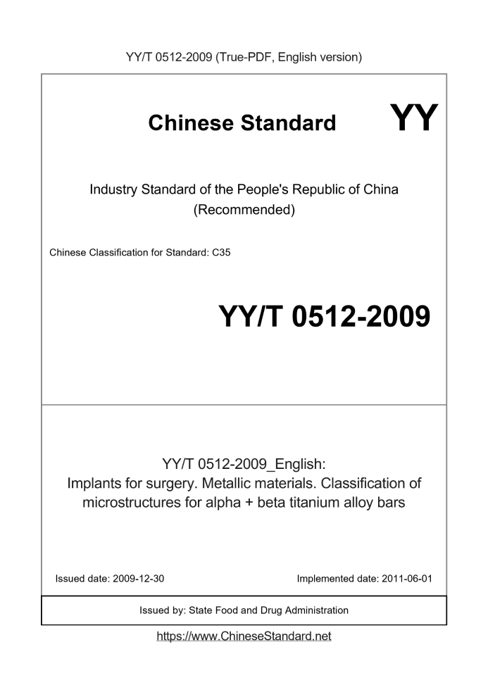 Delivery: <= 3 days. True-PDF full-copy in English will be manually translated and delivered via email. YY/T 0512-2009: Implants for surgery. Metallic materials. Classification of microstructures for alpha + beta titanium alloy bars Status: Valid