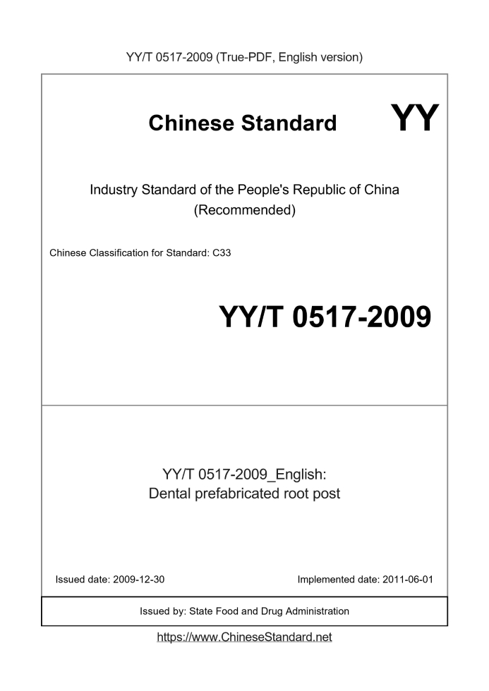 Delivery: <= 3 days. True-PDF full-copy in English will be manually translated and delivered via email. YY/T 0517-2009: Dental prefabricated root post Status: Valid