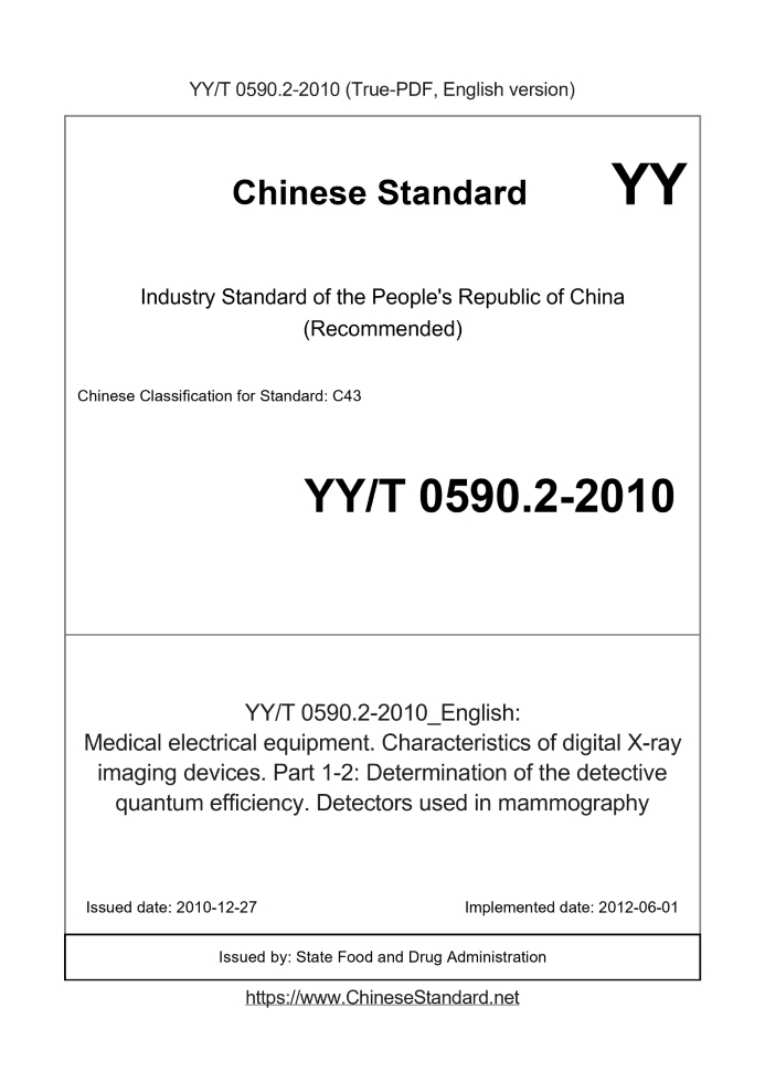 Delivery: <= 4 days. True-PDF full-copy in English will be manually translated and delivered via email. YY/T 0590.2-2010: Medical electrical equipment. Characteristics of digital X-ray imaging devices. Part 1-2: Determination of the detective quantum efficiency. Detectors used in mammography Status: Valid