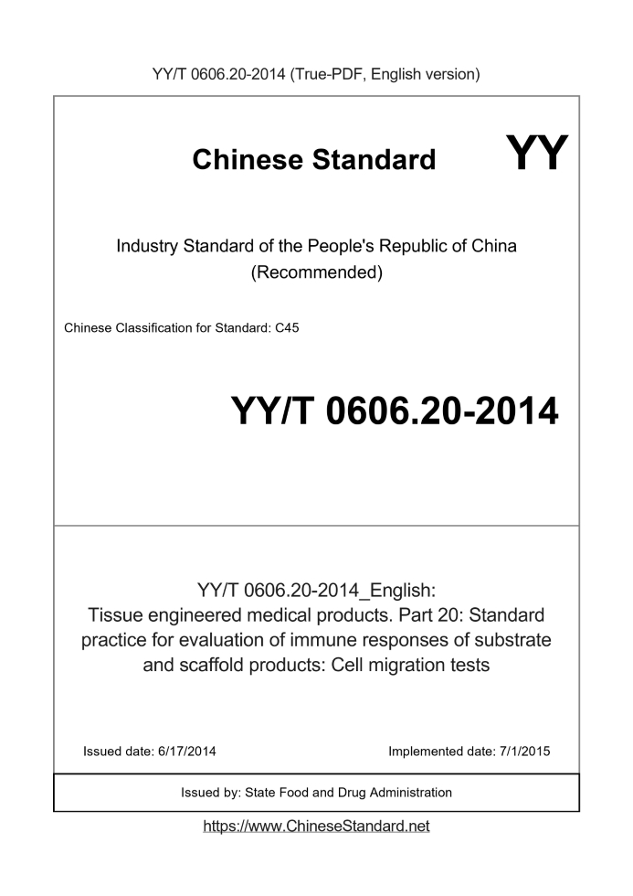 Delivery: <= 3 days. True-PDF full-copy in English will be manually translated and delivered via email. YY/T 0606.20-2014: Tissue engineered medical products. Part 20: Standard practice for evaluation of immune responses of substrate and scaffold products: Cell migration tests Status: Valid