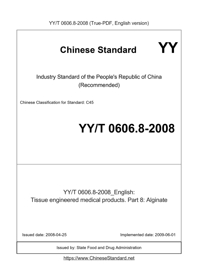 Delivery: <= 3 days. True-PDF full-copy in English will be manually translated and delivered via email. YY/T 0606.8-2008: Tissue engineered medical products. Part 8: Alginate Status: Obsolete