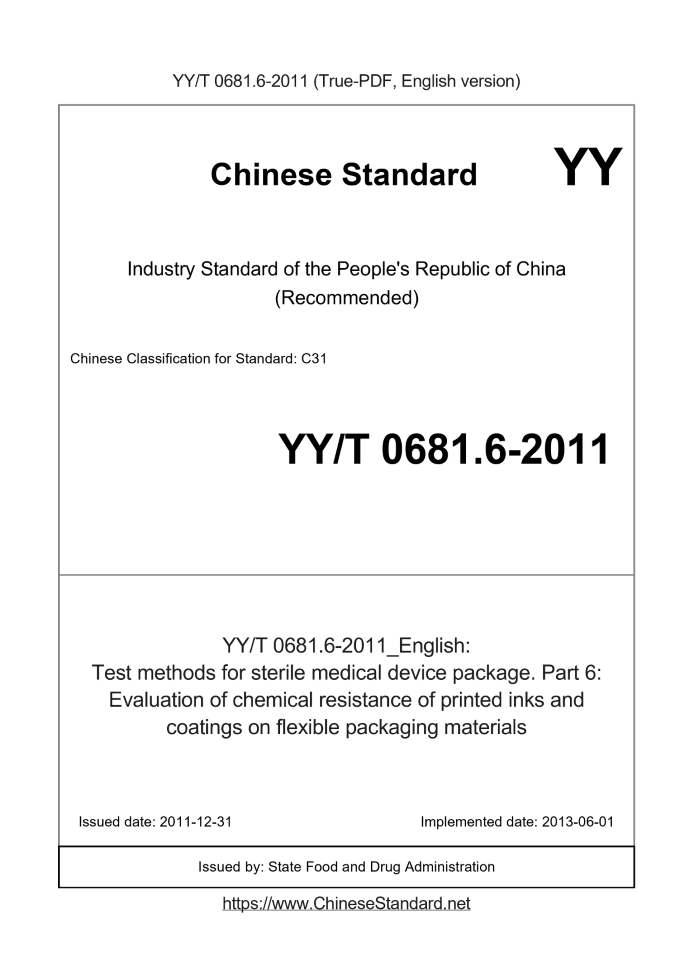 Delivery: <= 3 days. True-PDF full-copy in English will be manually translated and delivered via email. YY/T 0681.6-2011: Test methods for sterile medical device package. Part 6: Evaluation of chemical resistance of printed inks and coatings on flexible packaging materials Status: Valid