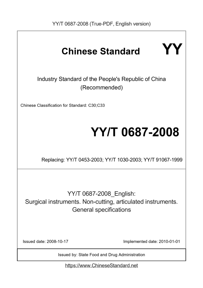 Delivery: <= 3 days. True-PDF full-copy in English will be manually translated and delivered via email. YY/T 0687-2008: Surgical instruments. Non-cutting, articulated instruments. General specifications Status: Valid