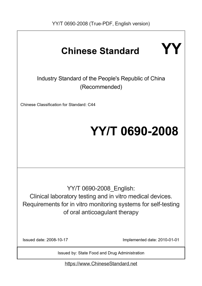 Delivery: <= 6 days. True-PDF full-copy in English will be manually translated and delivered via email. YY/T 0690-2008: Clinical laboratory testing and in vitro medical devices. Requirements for in vitro monitoring systems for self-testing of oral anticoagulant therapy Status: Valid