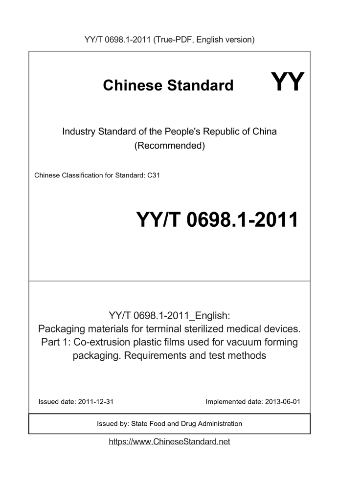 Delivery: <= 3 days. True-PDF full-copy in English will be manually translated and delivered via email. YY/T 0698.1-2011: Packaging materials for terminal sterilized medical devices. Part 1: Co-extrusion plastic films used for vacuum forming packaging. Requirements and test methods Status: Valid
