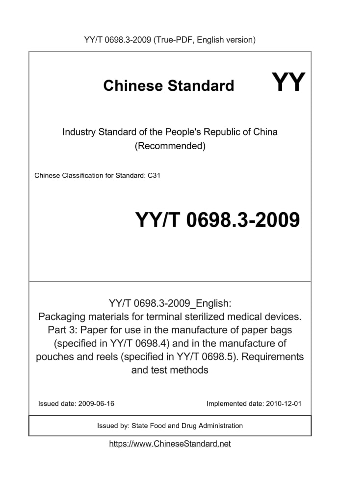 Delivery: <= 3 days. True-PDF full-copy in English will be manually translated and delivered via email. YY/T 0698.3-2009: Packaging materials for terminal sterilized medical devices. Part 3: Paper for use in the manufacture of paper bags (specified in YY/T 0698.4) and in the manufacture of pouches and reels (specified in YY/T 0698.5). Requirements and test methods Status: Valid